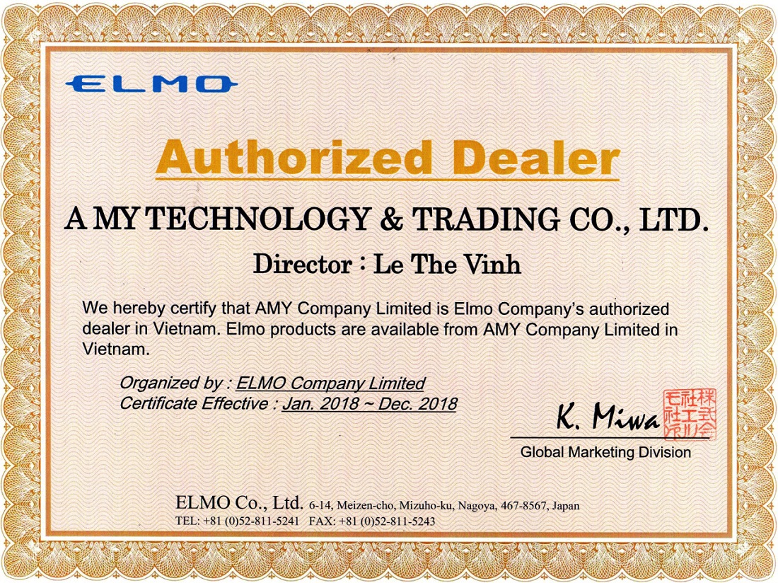 Hợp tác cùng công ty ELMO Nhật Bản, Siêu thị máy văn phòng Á Mỹ đã có giấy chứng nhận kí kết trong năm 2018, chính thức là nhà phân phối máy chiếu vật thể ELMO cho lớp học thông minh.