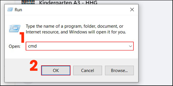 - Chọn Start > Run (hoặc nhấn tổ hợp phím Windows + R) > Nhập “cmd” > OK.