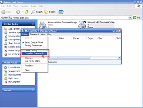 Bước 4: Nhấn vào “File” và chọn “Cancel All Documents”. Lưu ý, nếu bạn thấy máy vẫn tiếp tục lệnh in hiện thời, hãy khởi động lại máy tính.