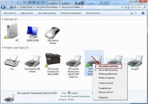 Bước 3: Trong mục “Printers” nhấn chuột phải vào máy in hiện hành của bạn và chọn “See What’s Printing”. Danh sách các lệnh in đang chờ thực hiện sẽ xuất hiện.