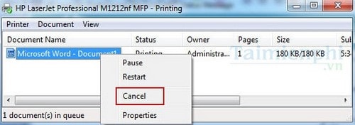 Một cửa sổ mới hiện ra, nhấn chuột phải vào file đang tiến hành in chọn Cancel.