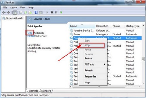 Bước 3: Trong cửa sổ Services, tìm đến mục Print Spoole. Sau đó nhấn chuột phải chọn Stop để hủy lệnh in ngay tức thì.