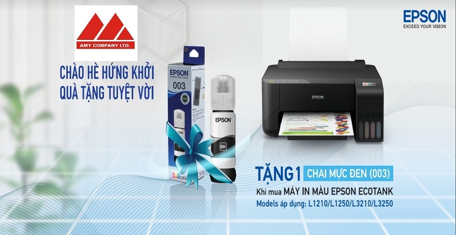 Khi mua máy in phun màu Epson L1210/1250/3210/3250 tại siêu thị máy văn phòng Á Mỹ khách hàng sẽ được tặng 1 lọ mực đen 003 Epson chính Hãng