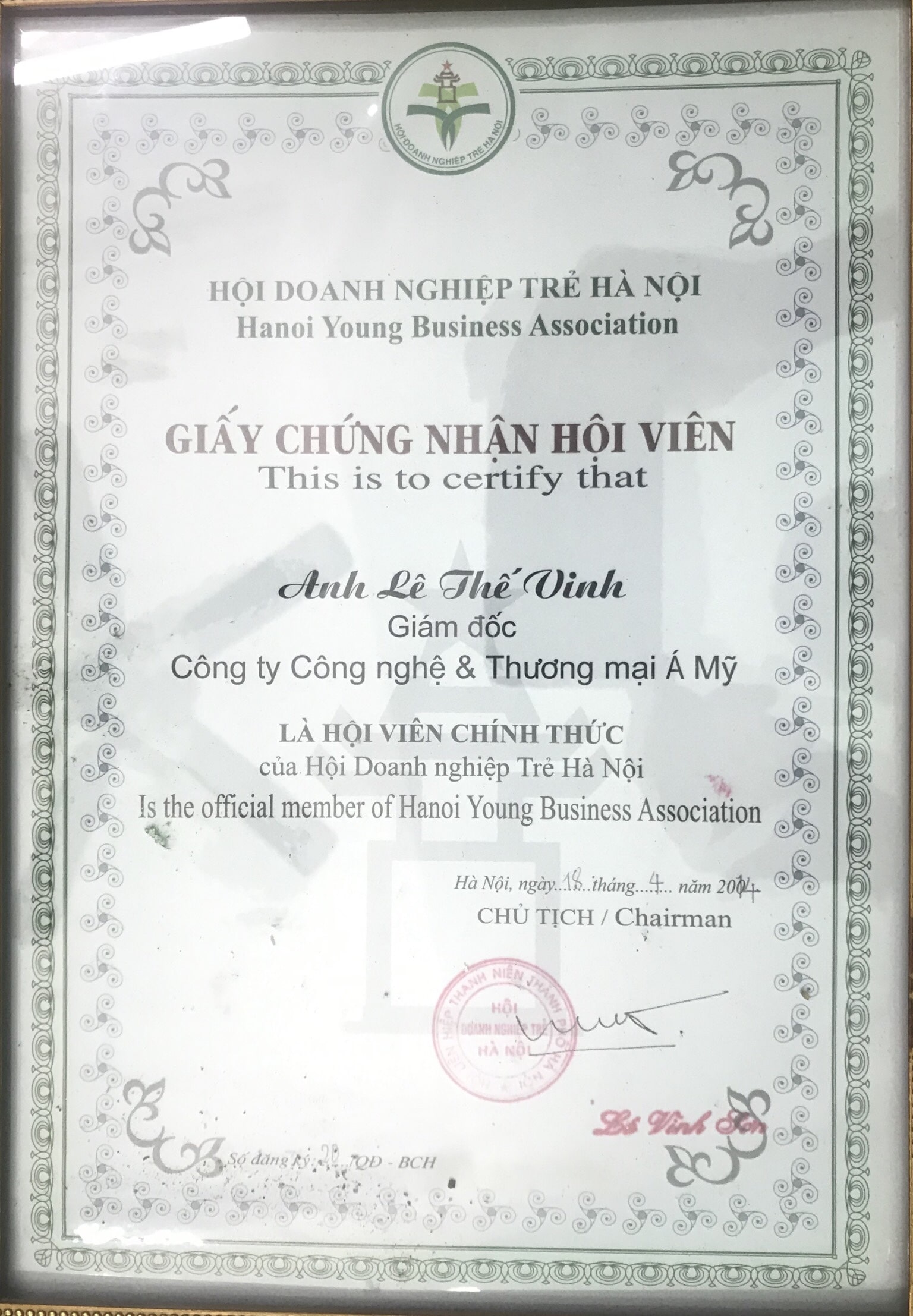 Giấy chứng nhận hội viên chính thức của Hội Doanh nghiệp trẻ Hà Nội