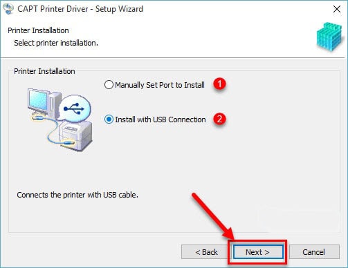 Khi đã chuẩn bị dây kết nối với máy tính và máy in thì bạn lựa chọn (2) và nhấn Next để tiếp tục.
