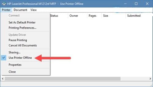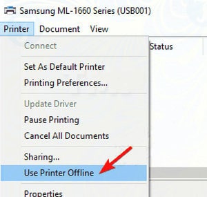 - Trên cửa sổ đó, nhấn chọn Printer và bỏ tích trong phần Use Printer Offline. Nếu đã không có dấu tích, bạn đánh tích chọn sau đó chờ khoảng vài giây và bỏ chọn Use Printer Offline.