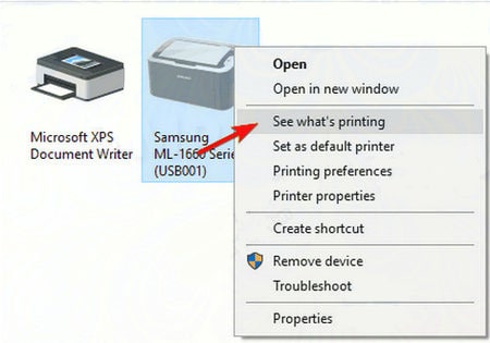 - Nhấp chuột phải vào biểu tượng máy in đang dùng và chọn See What’s Printing để xem danh sách tài liệu đợi in. Nếu cửa sổ hiện ra có danh sách tài liệu đang chờ thì xóa nó đi.