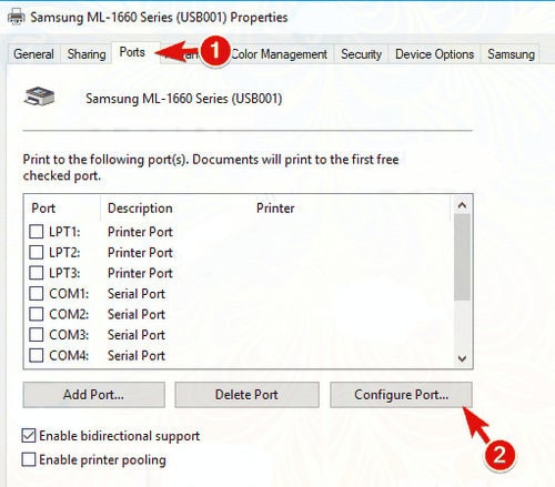 Bước 3: Xuất hiện cửa sổ Properties của máy in đó, chọn mục Ports. Bạn chọn địa chỉ máy in từ danh sách xuất hiện trong mục đó. Sau đó, nhấn chọn Configure Port.