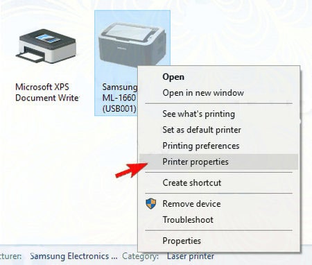 Bước 2: Chọn máy in hiện hành, kích phải chuột và chọn Printer properties.