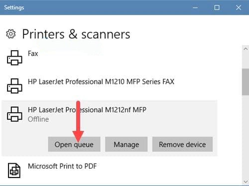 Bước 2: Trong cửa sổ hiển thị cài đặt phần Printers & Scanners, bạn nhấp chuột vào máy in có chữ Offline ở dưới và chọn Open queue.