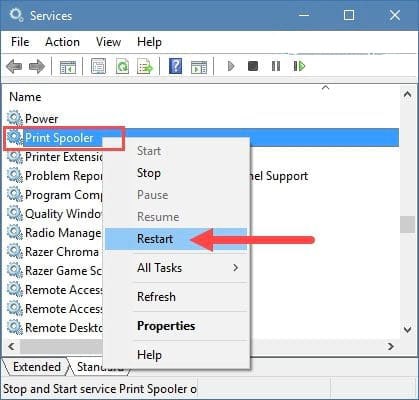 Bước 2: Khi xuất hiện hộp thoại Services, bạn kéo thanh trượt xuống tìm đến “Print Spooler”. Và kích nhấp phải chuột chọn Restart.