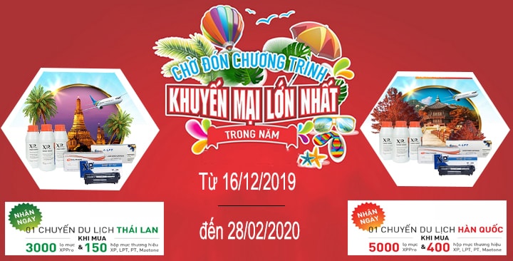 - Dành tặng 01 chuyến du lịch THÁI LAN khi mua 3000 lọ mực Xppro và 150 hộp mực thương hiệu XP, LPT, PT, Maetone.