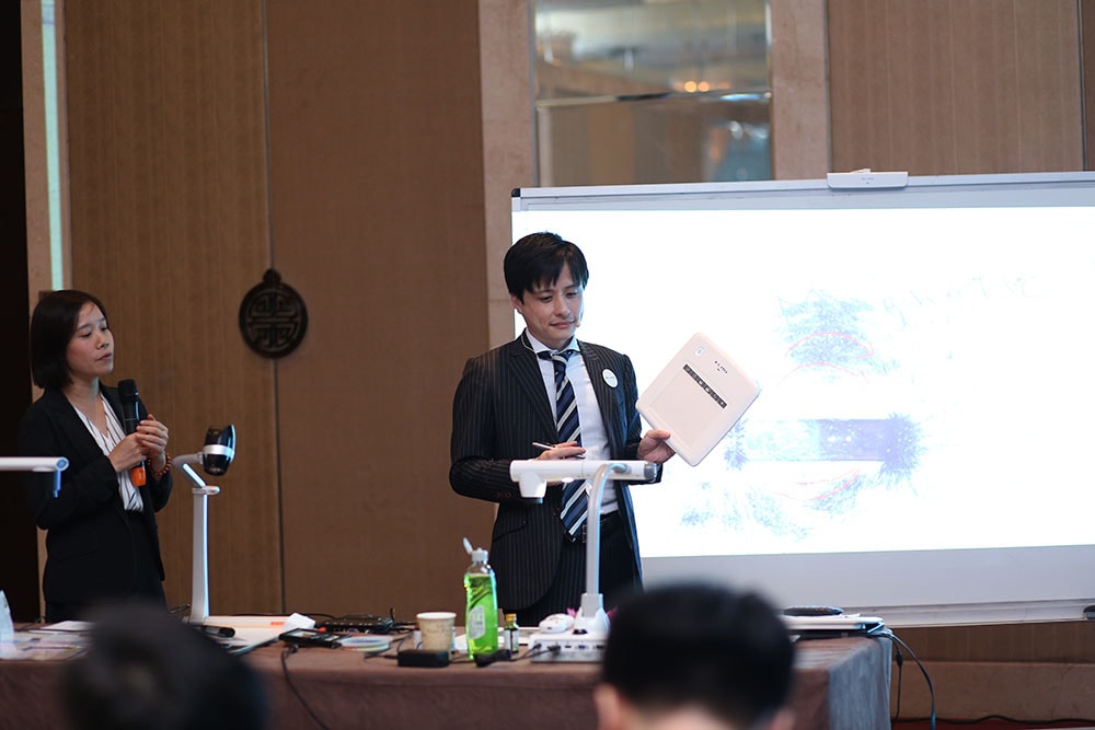 Kỹ thuật viên của Công ty TNHH Công nghệ và thương mại Á Mỹ hướng dẫn khách mời sử dụng máy chiếu vật thể ELMO