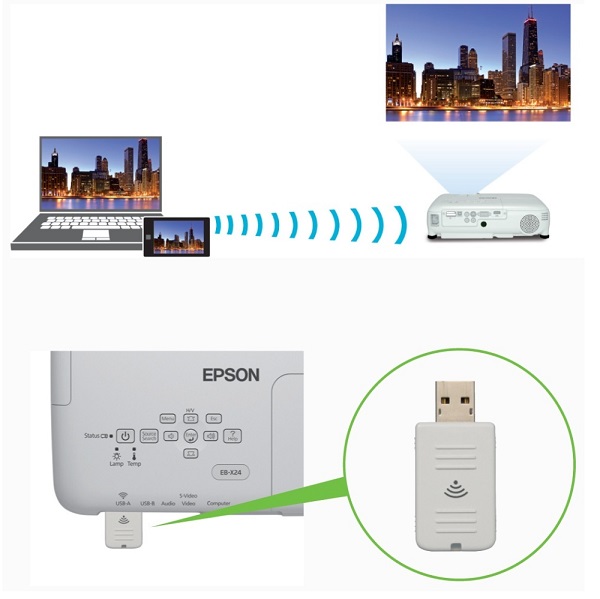Máy chiếu Epson dễ dàng kết nối với các thiết bị không dây khi được lắp thêm USB Wifi cho máy chiếu Epson khiến việc trình chiếu nhanh chóng và đơn giản hơn bao giờ hết.