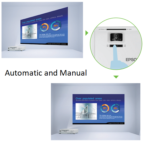 Máy chiếu Epson trang bị tính năng tự động căn chỉnh méo hình khi máy chiếu xác định hình ảnh bị méo giúp tích kiệm thời gian chuẩn bị trình chiếu nhưng cũng có thể điều chỉnh bằng tay theo chiều dọc hoặc chiều ngang để tinh chỉnh sao cho hợp mắt nhất.