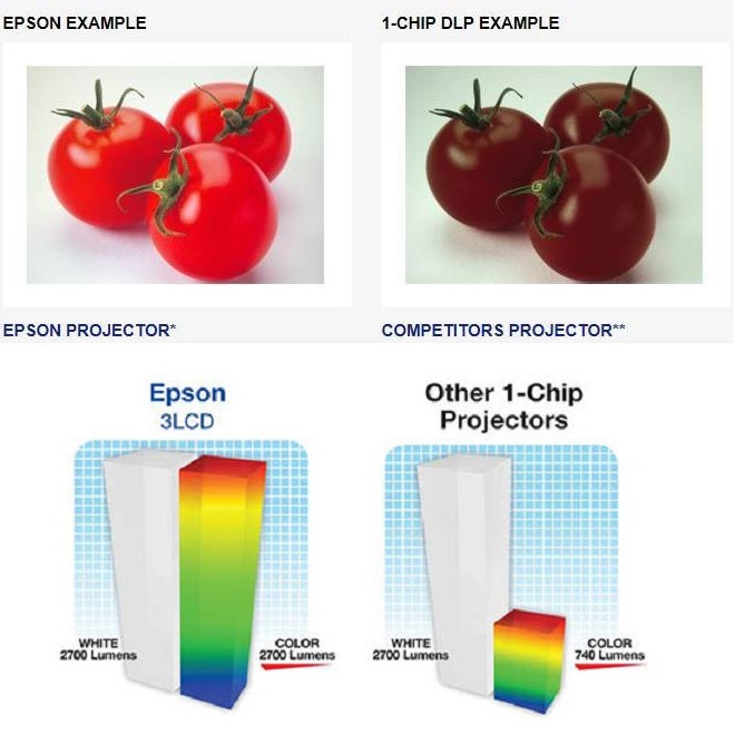 Máy chiếu Epson sử dụng công nghệ 3LCD (3 chip) có màu sắc tươi sáng hơn gấp 3 lần so với các đối thủ cạnh tranh kèm độ phân giải hợp lý XGA cùng công nghệ 3LCD đảm bảo hình ảnh sống động khiến máy chiếu Epson là máy chiếu lý tưởng cho ngành giáo dục hiện đại cùng một mức giá phải chăng. (Ví dụ với cùng cường độ sáng phát ra là 2700 Lumens)
