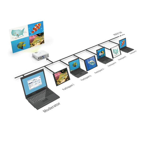 Đa số máy chiếu Epson ngoài tính năng trình chiếu đơn giản từ 2 nguồn khác nhau Epson còn hỗ trợ một tính năng cực kỳ hữu ích cho ngành giáo dục, thay vì từng máy phải kết nối với máy chiếu Epson thì chúng ta có thể kết nối lên tới 50 điểm đầu cuối nhờ 1 một máy chủ. Đây là tính năng tuyệt vời dành cho những phòng LAB học tập, không cần phải di chuyển máy tính lên đến điểm trình chiếu tích kiệm rất nhiều thời gian.