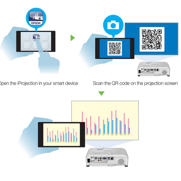 Chỉ bằng việc quét QR Code Reader ta đã có thể thiết lập việc trình chiếu dữ liệu dễ dàng từ các thiết bị chạy IOS như Iphone,Ipad hay các thiết bị chạy Android như điện thoại SamSung, máy tính bảng … mà không gặp bất kỳ trở ngại nào
