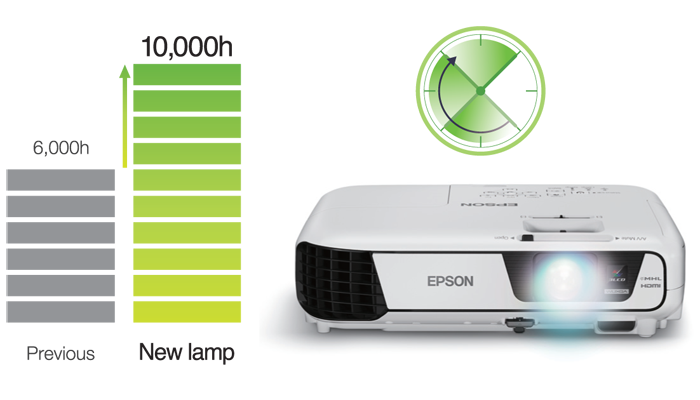 Tuổi thọ bóng đèn Epson lên đến 10,000h cao hơn hẳn với các mode máy trước, giảm thiểu chi phí thay thế bảo trì